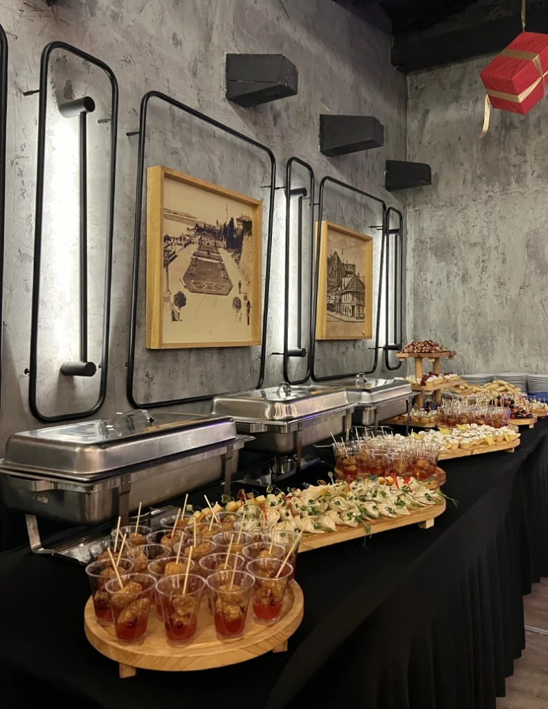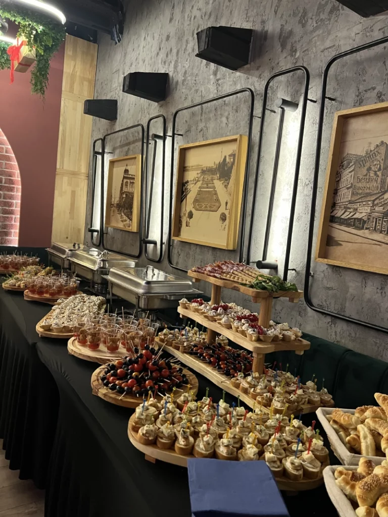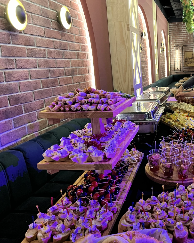 - Mini burgeri, Pileći takitosi, Brusketi sa pečurkama, dimljeni losos na bagetu, Hrskavi gambori, Pileći pate sa tartufima